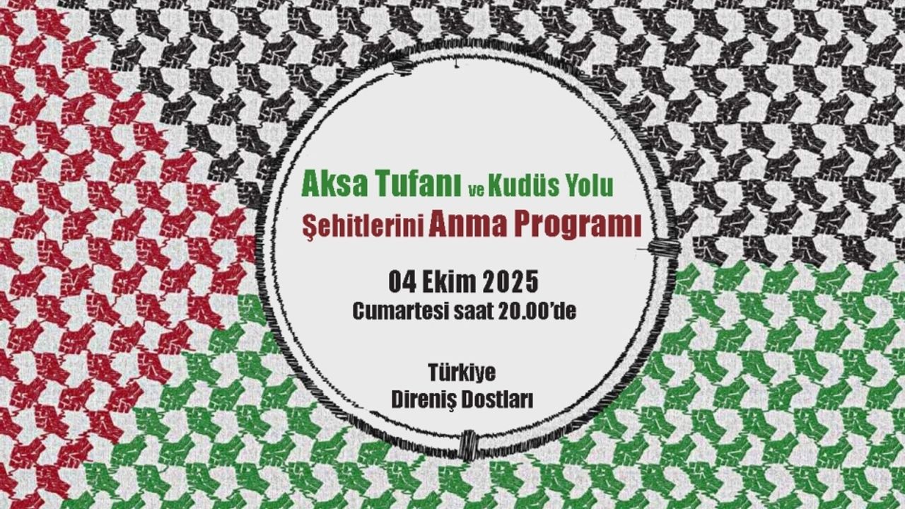 'Türkiye Direniş Dostları' tarafından 4 Ekim Cumartesi günü saat 20.00’de Bağcılar Belediyesi Başkanlık Sahnesi Konferans Salonu’nda “Aksa Tufanı ve Kudüs Yolu Şehitleri Anma Etkinliği” düzenlenecek. Programda Kudüs ve Gazze şehitlerinin hatırası anılacak, Direniş Cephesi’ne bağlılık vurgulanacak. Organizasyon komitesi, tüm direniş dostlarını etkinliğe davet etti.